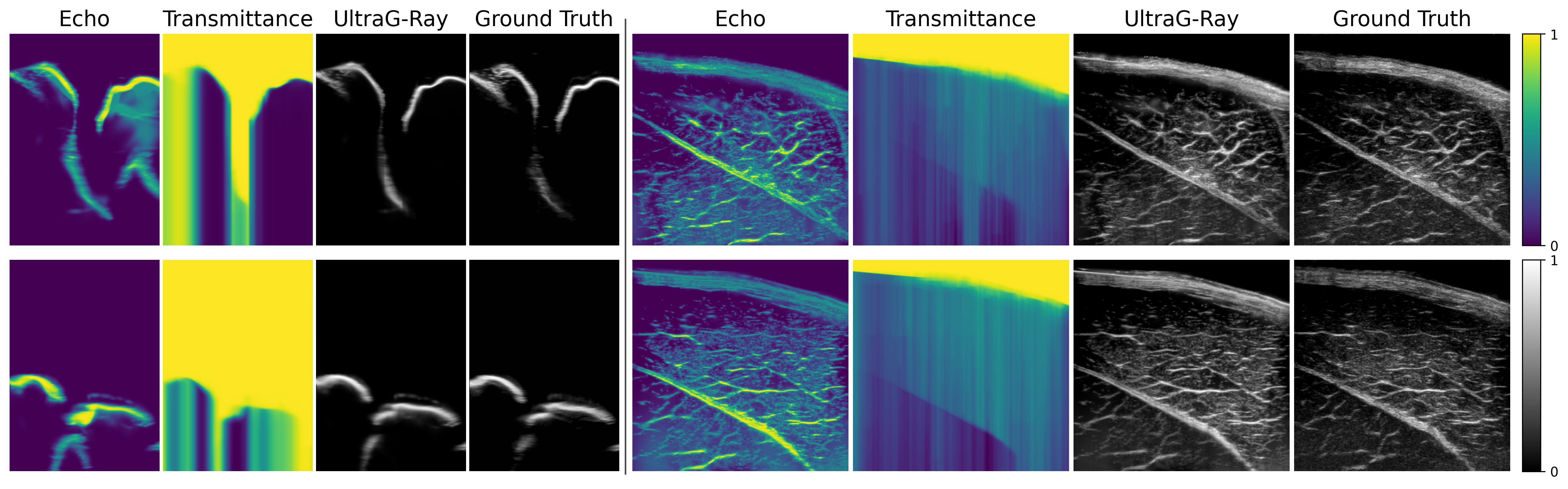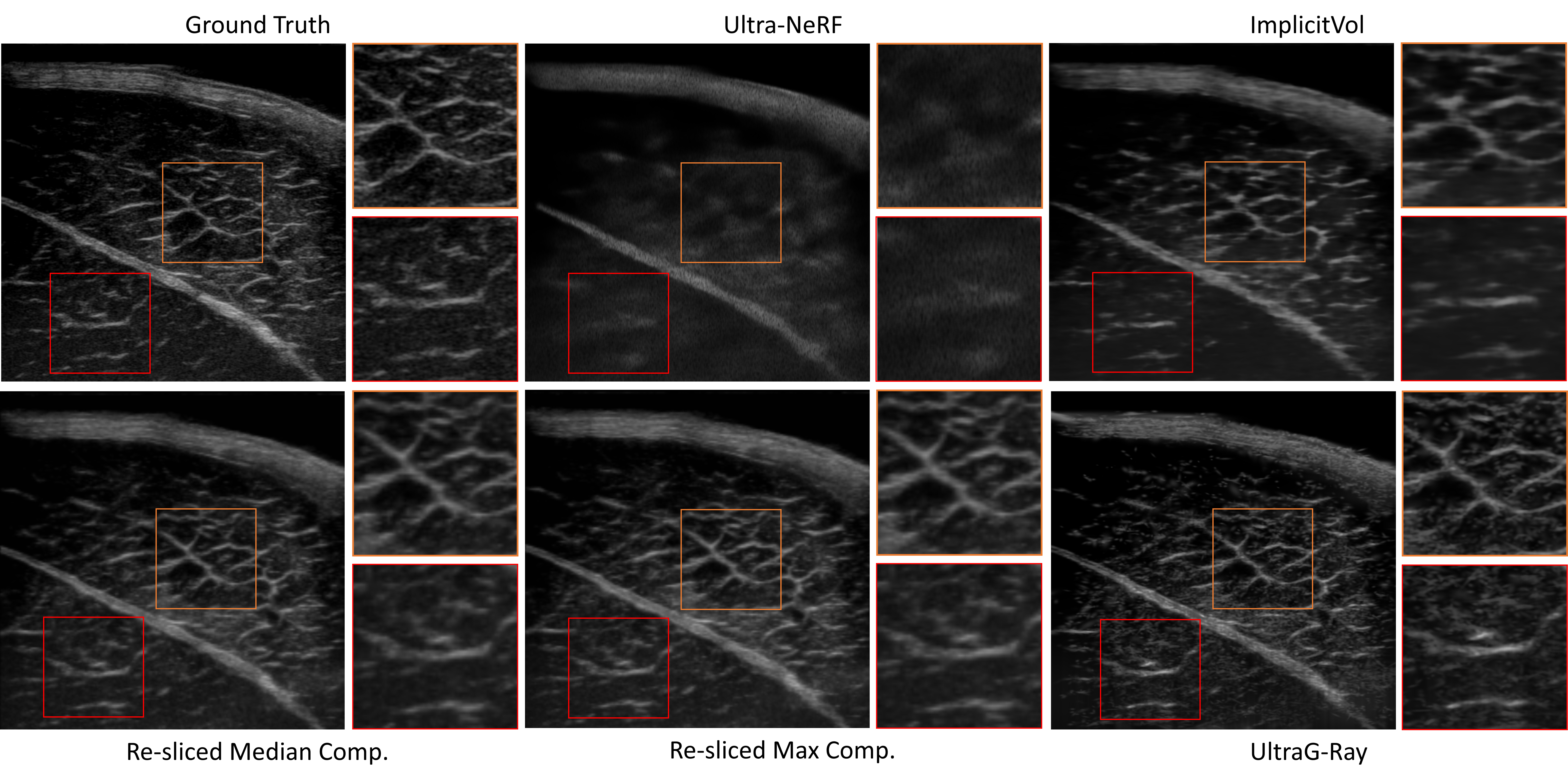On ex-vivo porcine muscle data, UltraG-Ray produces higher-fidelity reconstructions with clearer muscle fiber structures and improved contrast compared to prior approaches.
