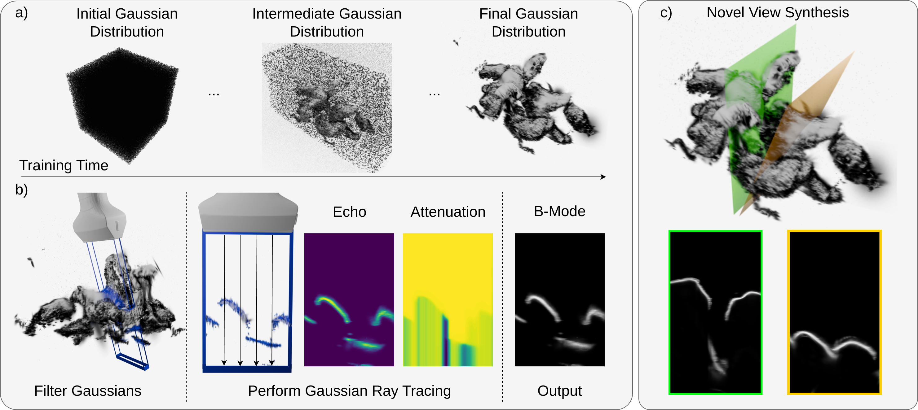 The pipeline shows progressive adaptation of the learnable 3D Gaussian distribution, followed by pose-based Gaussian filtering, Gaussian ray-intersection for echo and transmittance maps, and final B-mode image synthesis for novel-view generation.